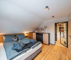 The apartment features 2 spacious bedrooms and 2 luxury bathrooms, providing you with all the comfort during your stay. For ultimate relaxation, you can use the infrared cabin and the jacuzzi. Imagine returning to your own private relaxation area after a day full of adventure, where you can enjoy the warmth of the sauna and the tranquility of the lounge area.