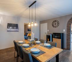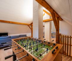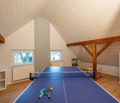 The house is modern and warmly decorated, with a spacious living room and a fully equipped kitchen. Outside you will find a private garden with a private terrace, ideal for cozy barbecues. For the children, there are outdoor play equipment such as a swing and a slide, and inside there is a playroom with children's games, a foosball table and a ping pong table.