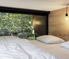 Small but nice. Incredibly nice, even! Because despite its small dimensions, you can still enjoy air conditioning, a fully equipped kitchen with everything you need, a cozy seating area with TV, and a huge window that directly overlooks the river, which is only 10 meters away. You also have a complete bathroom with shower, sink, and toilet. You will sleep on the upper floor in 2 mezzanine rooms. At first glance, they may seem to have a low ceiling, but you will get used to it immediately. One room has a double bed, the other has 2 single beds. Ideal for a family! Outside, you have a garden and a wooden terrace where you can eat and have a barbecue. Good to know: your dog is also welcome here!