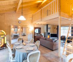 This comfortable chalet on one level can accommodate up to six guests for a stay in a peaceful, quiet, beautifully wooded area of 1,000 m² . Its charming decor and sauna help to create a cosy cocoon for your holidays. Its rustic style entirely in wood gives it a warm ambience worthy of a mountain chalet! The bright, open living space consists of a dining room with an authentic jukebox...