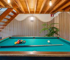 In the cozy living room, a fireplace is ready to provide cozy evenings, while you can relax in the outdoor jacuzzi or the sauna. For the sporty and game lovers, there is a pool table, a table football game, and a ping pong table. The playroom is equipped with various children's games and offers plenty of entertainment for young and old.
