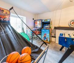 Inside, the house offers plenty of recreational opportunities. There is a spacious game room with a pinball machine, foosball table, darts, shuffleboard and electronic café games. Additionally, there is a comfortable bar where you can enjoy a drink.